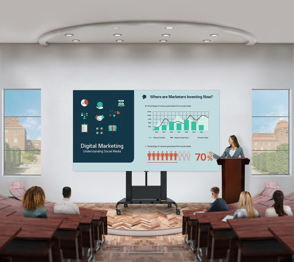 Pensato per sale riunioni, videoconferenze e auditorium, il nuovo LG LED Screen All-in-one da 136″ produce immagini senza precedenti con la chiarezza e la luminosità della tecnologia LED, con passo da 1.56mm e design privo di cornici. È stato studiato come soluzione plug and play all-in-one completamente ottimizzata, con processore di segnale precalibrato e integrato.
