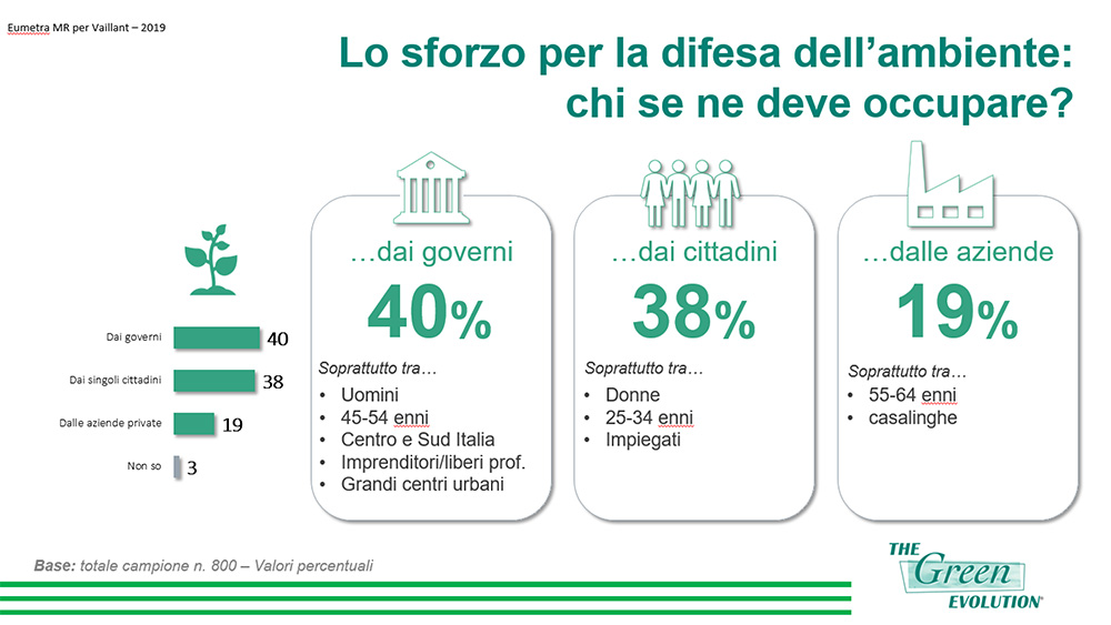 Le ricerche, dal titolo “L’atteggiamento Green degli italiani” e “La sensibilità e la preoccupazione sul tema ambiente”, fanno parte del programma The Green Evolution di Vaillant, iniziativa focalizzata sull’impegno dell’azienda verso la salvaguardia del Pianeta, e segnano una nuova tappa in un percorso di ascolto e analisi dei comportamenti degli italiani che ha tra i suoi obiettivi quello di contribuire a diffondere stili di vita e di consumo sostenibili.