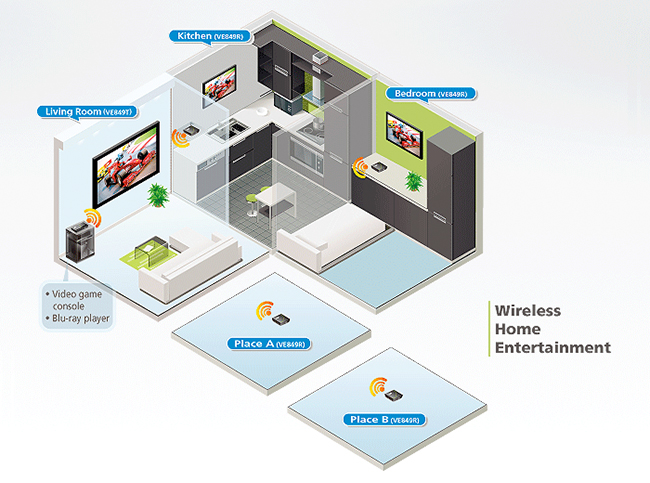 Il telecomando IR consente di passare da remoto tra i dispositivi sorgente HDMI dal lato ricevitore e permette di guardare contemporaneamente un HDTV locale e quattro connessi in modo wireless. Costituito da un trasmettitore HDMI wireless e il ricevitore, il VE849 consente di consolidare i dispositivi HDMI.