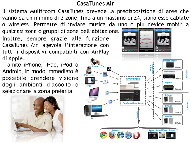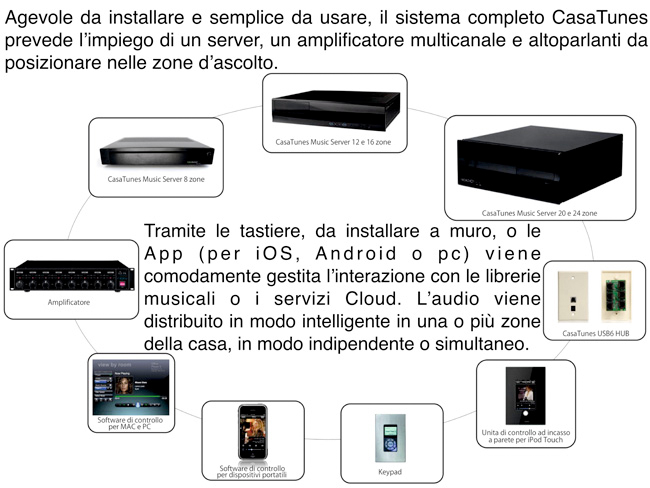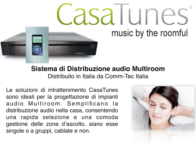 Con i prodotti CasaTunes, l’intrattenimento musicale in casa è garantito ai massimi livelli; capace di sonorizzare fino a 24 ambienti separati, offre la compatibilità anche con i device Apple via AirPlay.