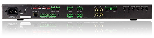 Il compatto GR3 (nelle due foto sopra) può essere montato a rack o su mobile ed ha 2 ingressi microfonici (il primo anche con un comodo connettore XLR) mono e due ingressi linea stereo con controlli per i livelli sul pannello anteriore, insieme ai controlli generali delle due zone di uscita. Il pannello posteriore vede la presenza dei connettori di tipo Euroblock (o Phoenix che dir si voglia), con ingressi di linea stereo doppiati con pin-jack (o RCA), le regolazioni volutamente nascoste per gain e toni dei microfoni, le uscite per due zone mono o stereo ed il connettore per il telecomando PL14.