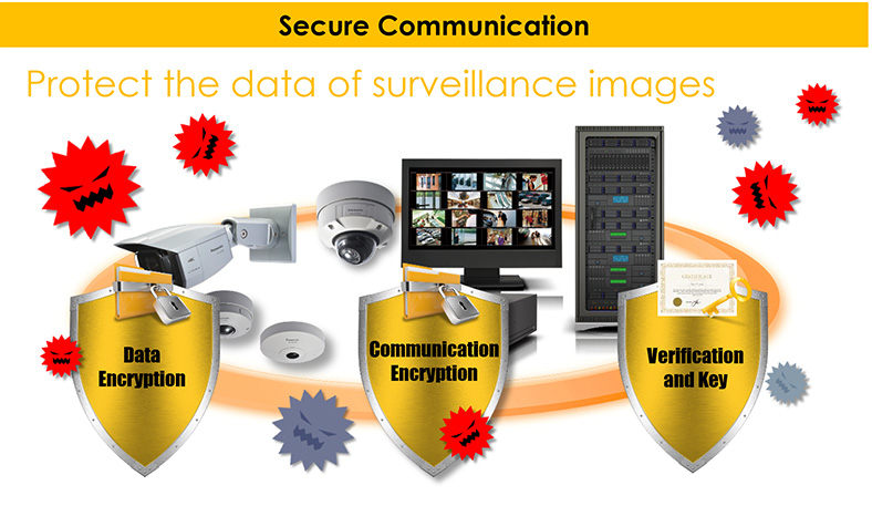 Tutte le telecamere sono dotate di certificati di crittografia caricati in modo sicuro da Panasonic, al fine di proteggere il sistema di videosorveglianza dagli accessi non autorizzati. Inoltre la tecnologia proprietaria Secure Communication è conforme alle normative GDPR, a garanzia della sicurezza e della protezione dei dati video registrati.